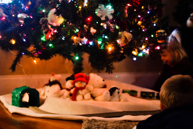 Of course it didn't end up being the perfectly circular track that I had pictured because Landon did it himself, but it is perfect in its own way. He has always loved trains and has several tracks and various engines from Thomas and Friends. He chose Percy to be our Christmas engine because he is green. Smart boy!